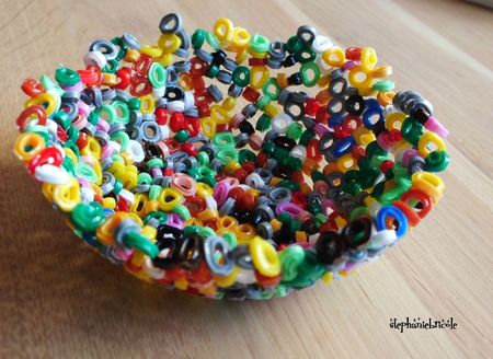 Par exemple un bol en perles HAMA fondues : il suffit de huiler un bol, de positionner les perles sur les bords, mettre le bol au four à 200° jusqu’à ce qu’elles s’aplatissent, de laisser refroidir et de démouler !